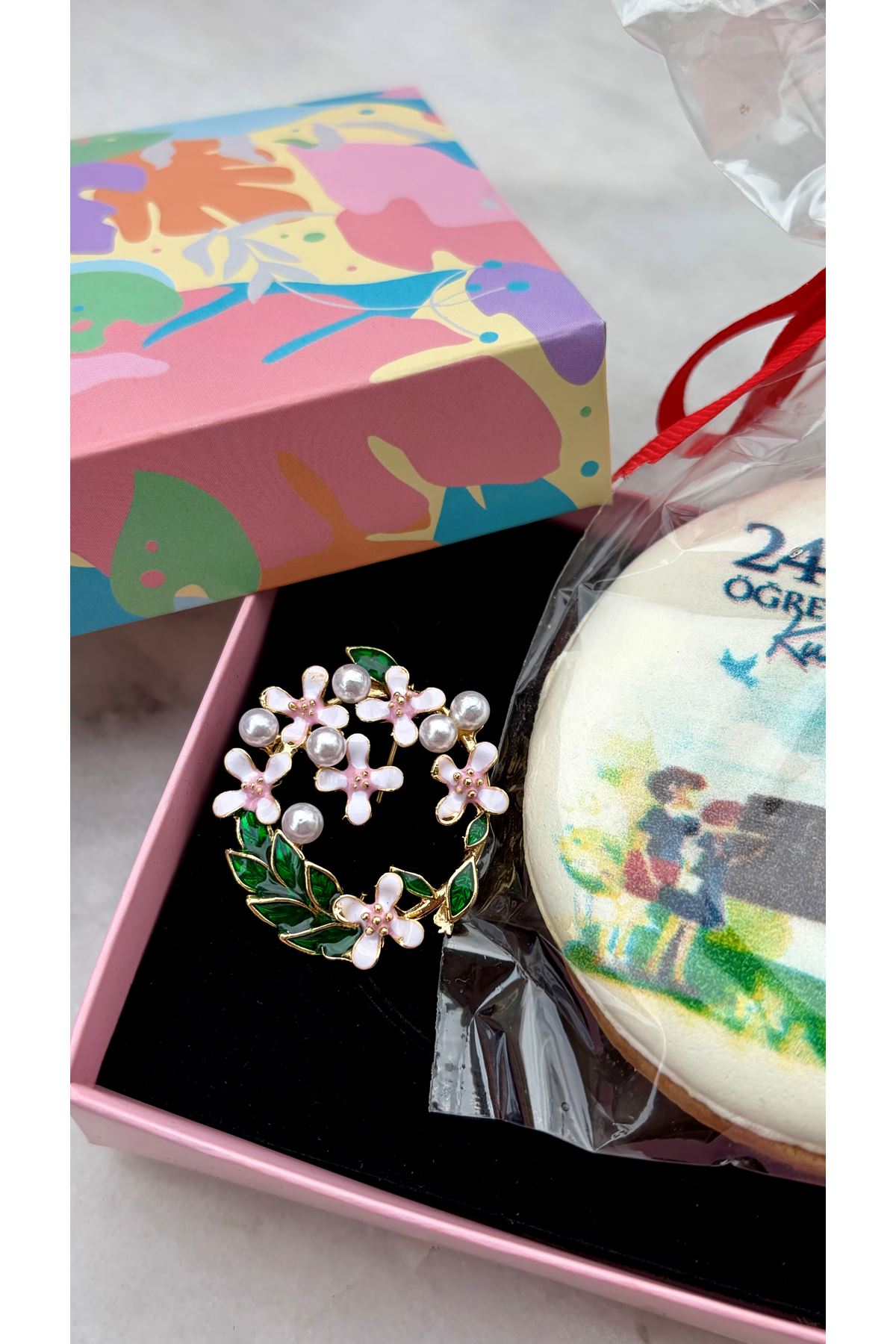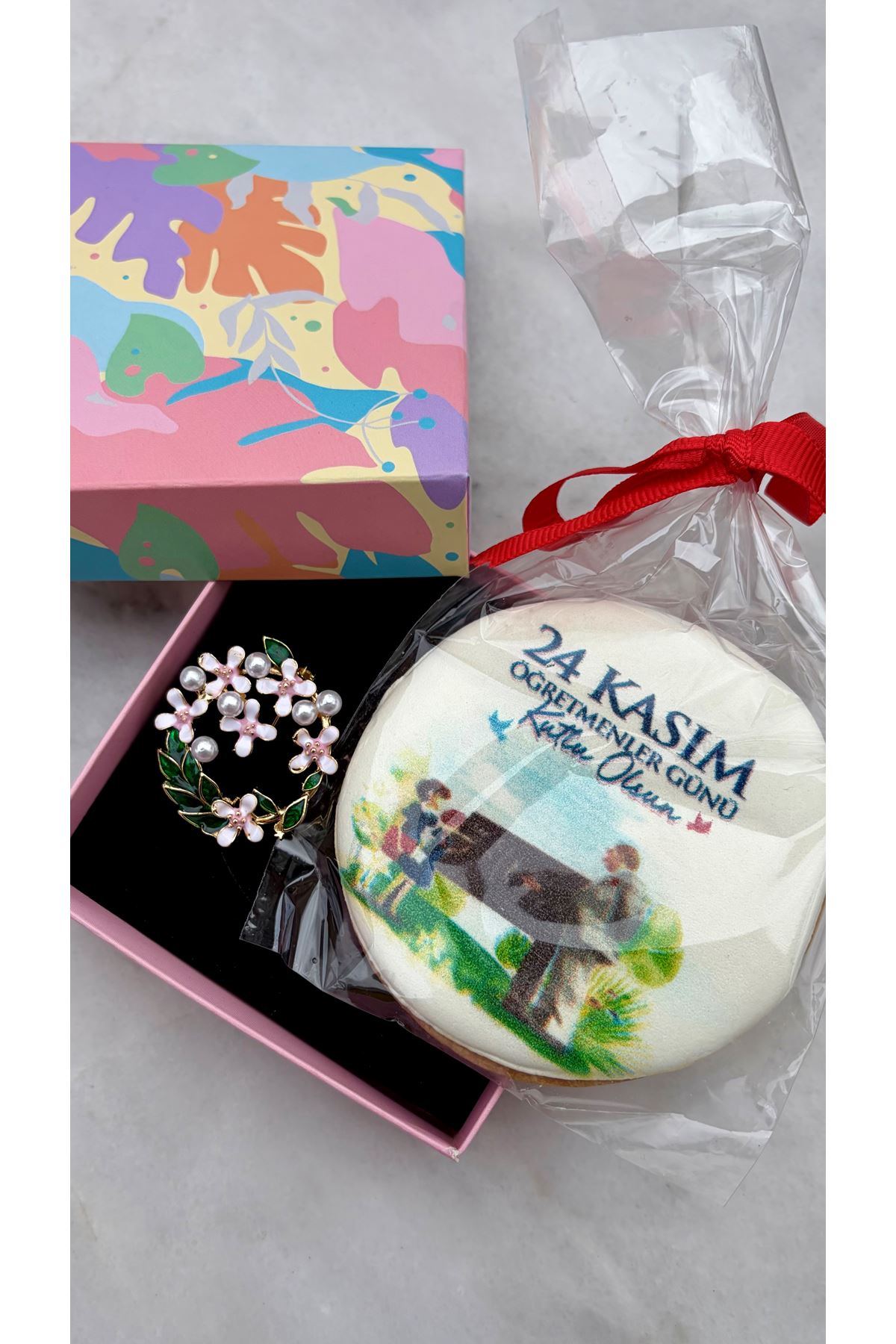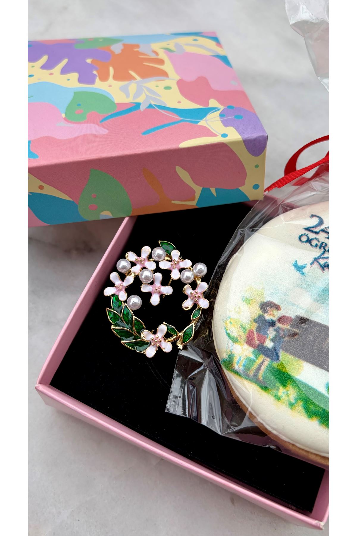 Broş ve baskılı tereyağlı kurabiye içeriklidir.